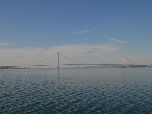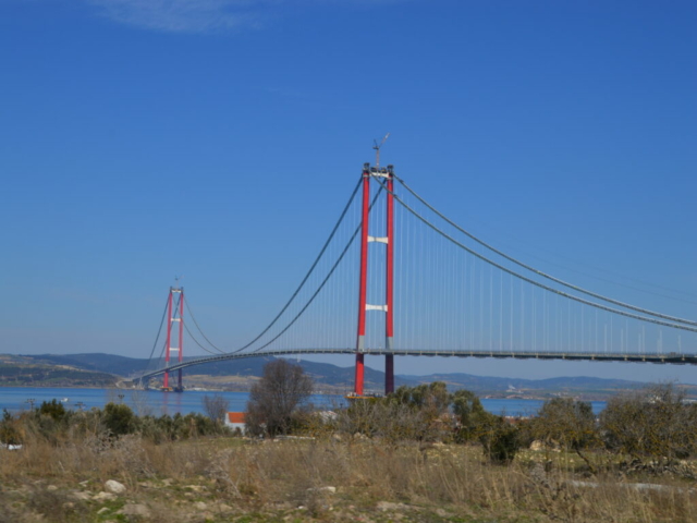 Mit der Fähre überqueren wir die Dardanellen und damit die Grenze zu Asien und bewundern die neue Canakkale-1915-Brücke, die neue Autobahnbrücke, welche in den nächsten Tagen eröffnet werden soll. Auf den ersten Blick erinnerte sie uns an die Golden Gate Bridge in San Francisco. Gemessen an ihrer Spannweite von 2023m ist sie die längste Hängebrücke der Welt. Wirklich faszinierend.